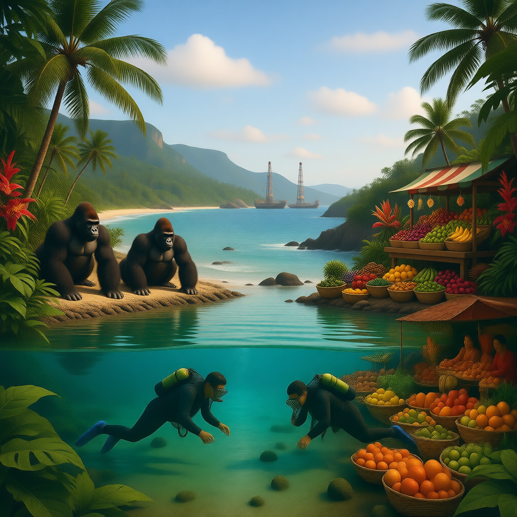 Джунгли с гориллами, побережье Атлантики, нефтяные вышки, рынок с экзотическими продуктами